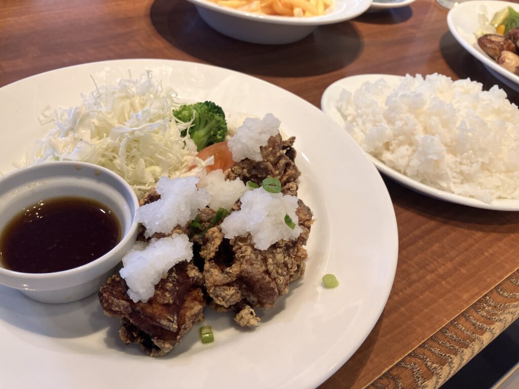 Crispy fried chicken served with grated daikon radish and a house special sauce. Paired with rice and a fresh salad, this set is satisfying and well-balanced.