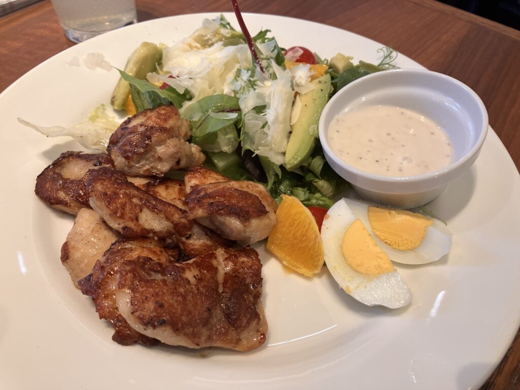 Grilled chicken served with a colorful salad, boiled egg, and orange slices. A great choice for those looking for a lighter, healthier meal.
