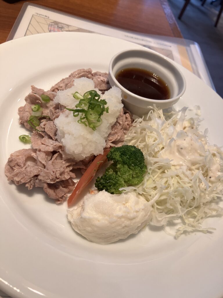 Thin slices of pork served with ponzu sauce and grated daikon, offering a refreshing taste perfect for spring.