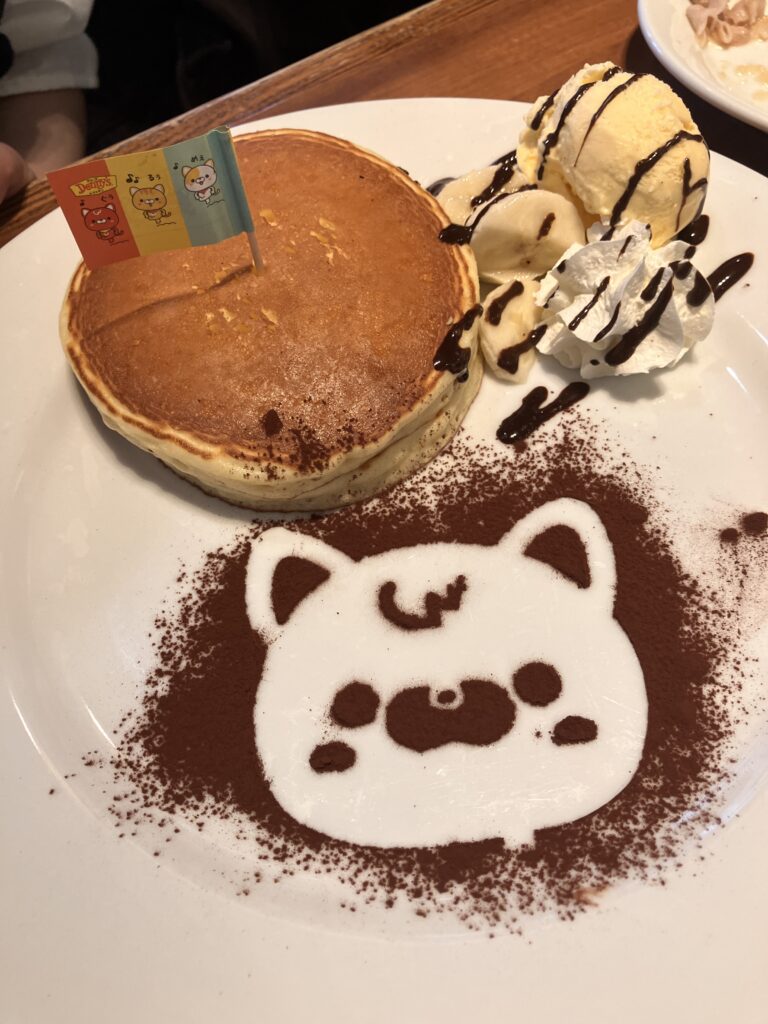 As part of their birthday celebration service, we received fluffy pancakes topped with banana slices, ice cream, and whipped cream, beautifully decorated with a cute character illustration and a festive flag. It made the day feel extra special.