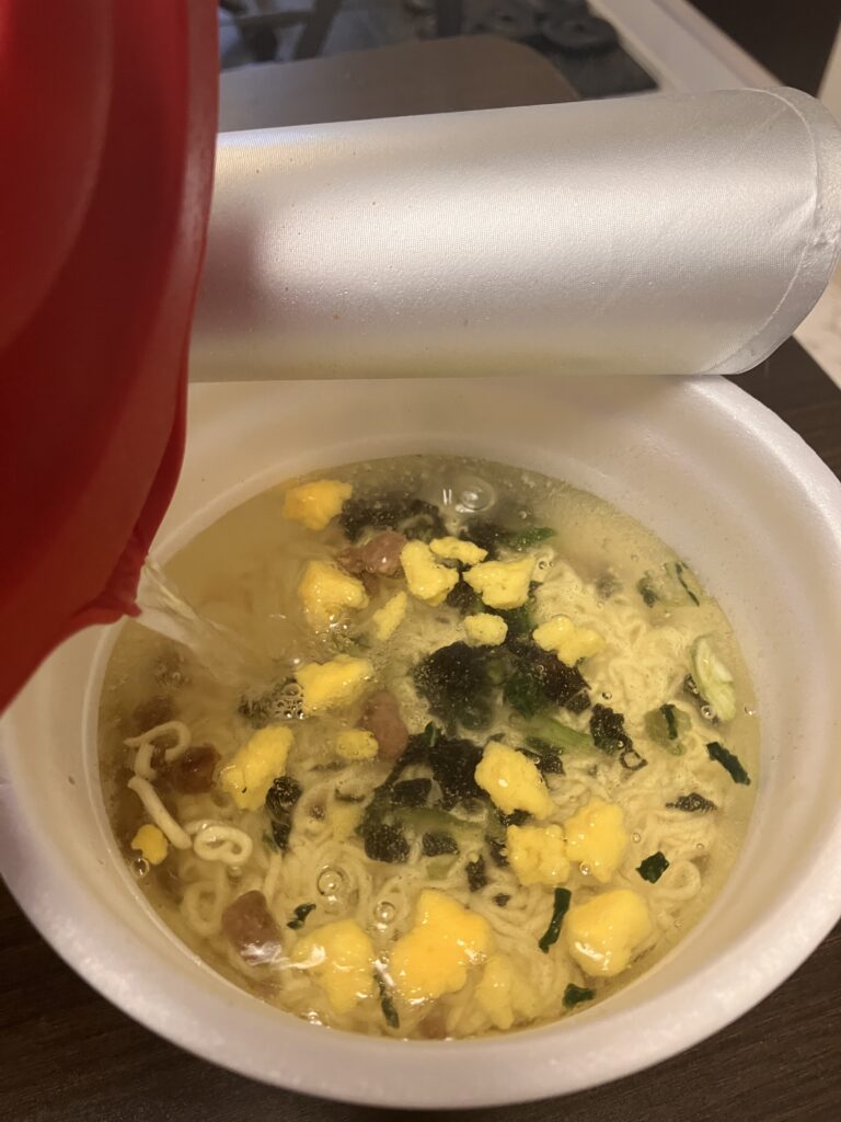 The bright yellow lid catches your eye right away. Inside, you’ll find noodles with some toppings such as egg, kikurage mushrooms, and bits of meat. The amount of toppings isn’t overwhelming, but they provide just enough accent to the bowl.